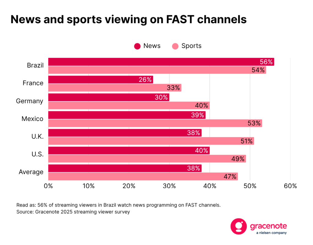 The increase in news and sports channels aligns with some of the key reasons why viewers are gravitating to FAST channels. This is particularly the case with sports, as approximately half of the streaming viewers in Brazil, Mexico, the U.K. and the U.S. watch sports programming on FAST channels.